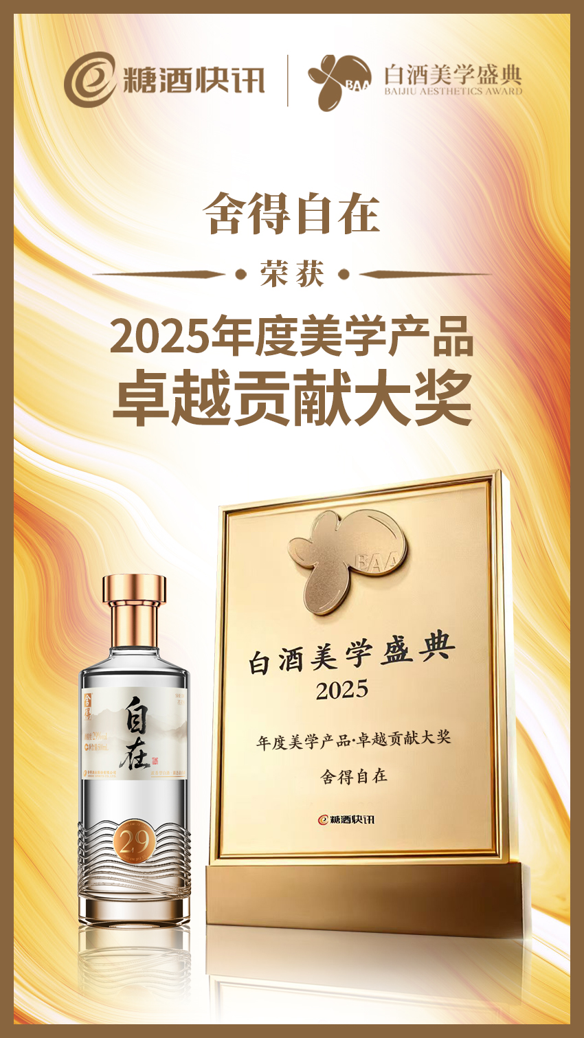 市场与行业也对舍得自在给予高度认可。11月20日,产品获中国轻工业联合会颁发的“2025中轻万花杯酿酒质量大赛大金奖”与“创新力产品奖”,彰显其卓越酒体品质。此前,在由糖酒快讯联合多家机构共同发起的“2025年度美学产品网络评选”中,舍得自在摘得“2025年度美学产品卓越贡献大奖”,体现了其在酒体品质、包装设计和文化表达上的全方位美学升级,为白酒行业发展注入了新活力与想象空间。