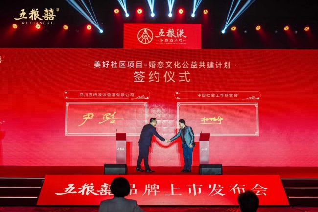 发布会现场,四川五粮液浓香酒有限公司与中国社会工作联合会正式签署合作协议,共同启动“美好社区-婚恋文化公益共建计划”。这标志着五粮囍品牌在响应国家婚俗改革、服务美好家庭建设的道路上,迈出了从商业价值到社会价值融合的关键一步,展现了品牌构建长远幸福生态的深远格局。